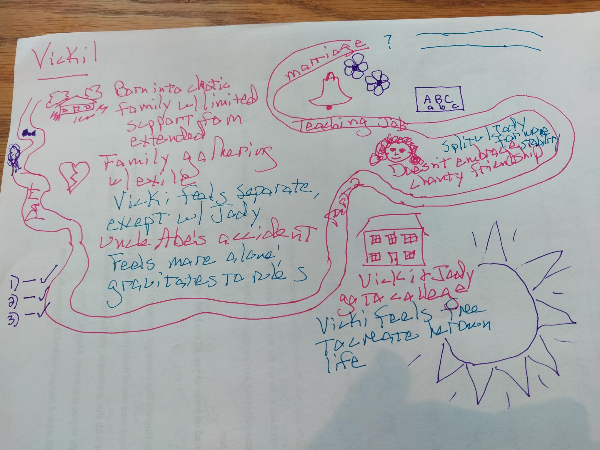 My current favorite approach utilizes words and visuals. I create a physical, character map that’s like a poster I can refer to and add to as I work on a manuscript. I start at the beginning of the character’s life. What symbolizes their early years? Who’s in the family? Where were they geographically? What from that time of their life helped form the person they are? I use words and pictures (for me, that’s often stick people) to illustrate the map. I choose colors to express a mood. I might write a few paragraphs (on the back of the map or in an accompanying notebook) to go along with it.