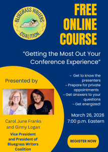 In this session we’ll talk about getting the most out of the upcoming BWC Conference of Writers! Get to know the presenters and their sessions, learn how to prepare for an appointment with an agent or online marketing guru, have a new headshot photo taken, learn how to network and find new writer friends. Join BWC Vice President Carol June Franks and President Ginny Logan as they share tidbits that will get you energized for the conference and give your writing an added spark.This session is free to everyone